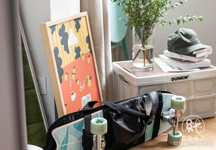去繁留简,阳台打通并入室内将临时办公和收纳区相结合。宅家办公时,在此创作或静思是个非常不错的好选择~