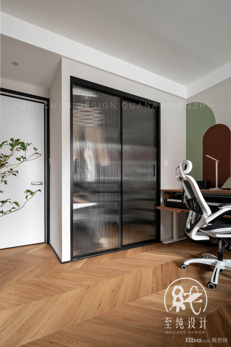 借客厅1/2空间做独立次卧,极窄线框门拉高视觉层高。次卧作为偶尔长辈或好友入住,整体设计偏暖色、清新及实用性。入内左侧以成品柜收纳,180*55的尺寸妥妥容纳居住人的衣物。