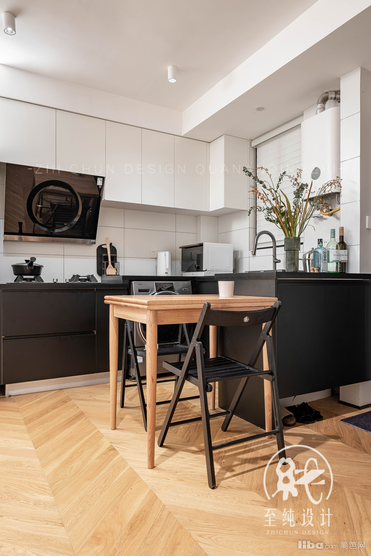 黑色既是永恒也是经典之色,橱柜台面及下柜统一暗黑色系,与上半白色形成鲜明对比,干净耐看同时,巧妙化解空间压抑感及偶尔下厨的油腻感,从客厅望看厨房视觉上更起到空间扩展拉远作用。
