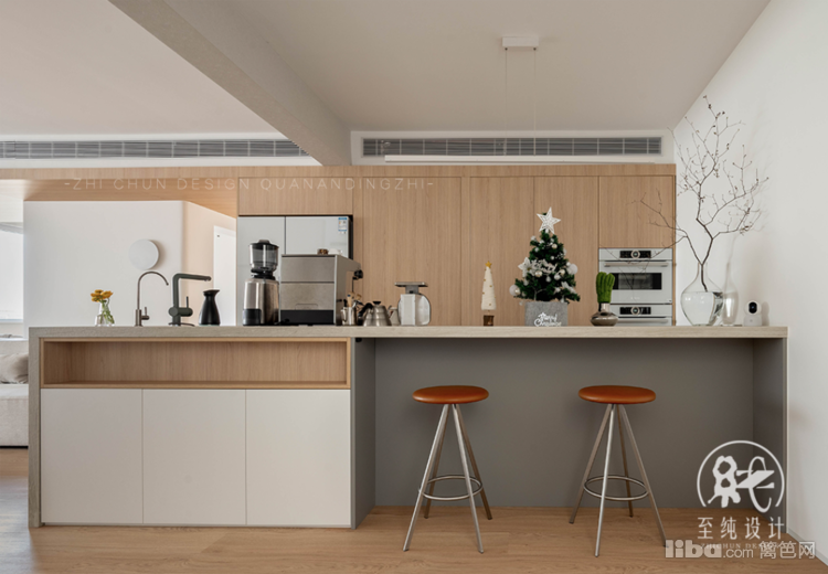 入户后的第一个功能空间设置了西厨和大岛台,进口岩板一体到位,精致美观。