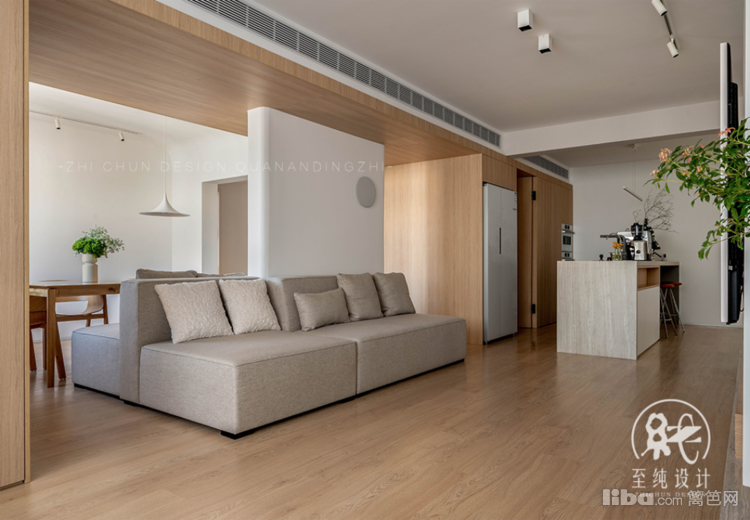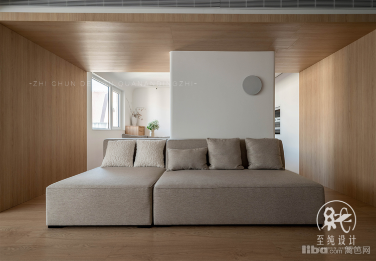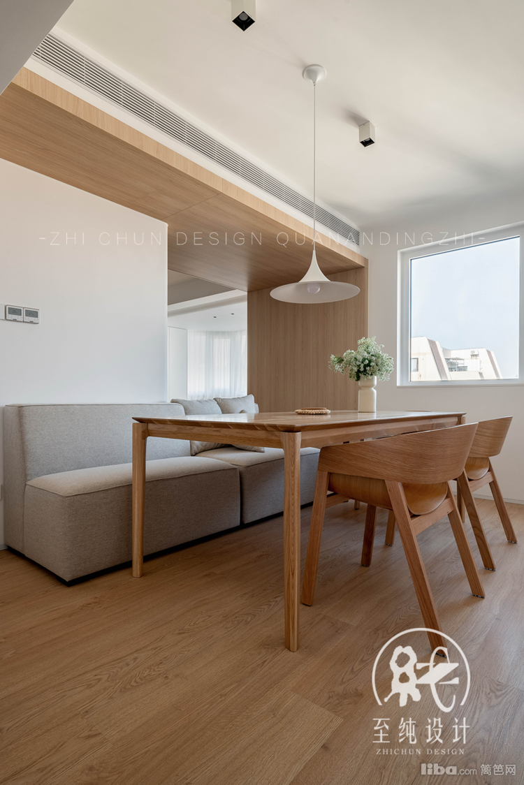 双面沙发包裹承重墙体,一面兼具餐椅,家庭聚会时可以容纳更多的家人共同团聚就餐。