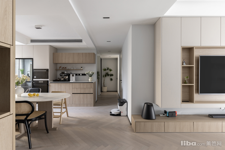 家里小物件较多,客厅的收纳集中在电视背景墙,一整排的电视加储物柜形式,收纳规整小朋友的玩具与书籍。