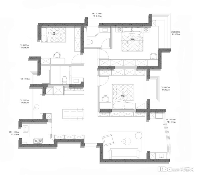 重整后的布局,借玻璃的通透及房门的朝向,无论是厨房与客厅,还是餐厅与客厅都可以形成南北通风格局,空间纵深感更大,进门通透性更强。