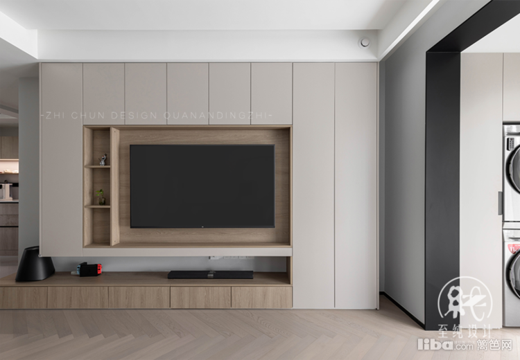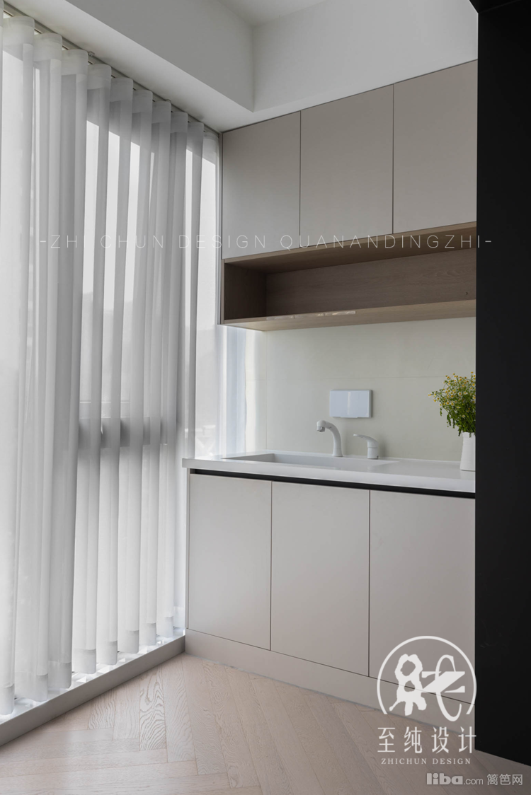根据屋主的需求及生活习惯,阳台兼具日常家务区与休闲区,左右两侧集洗衣机烘干机上下叠放,洗地机等,借四边空间余额增设收纳柜,既让生活用品规划收纳到此处,家务动线也更流畅。