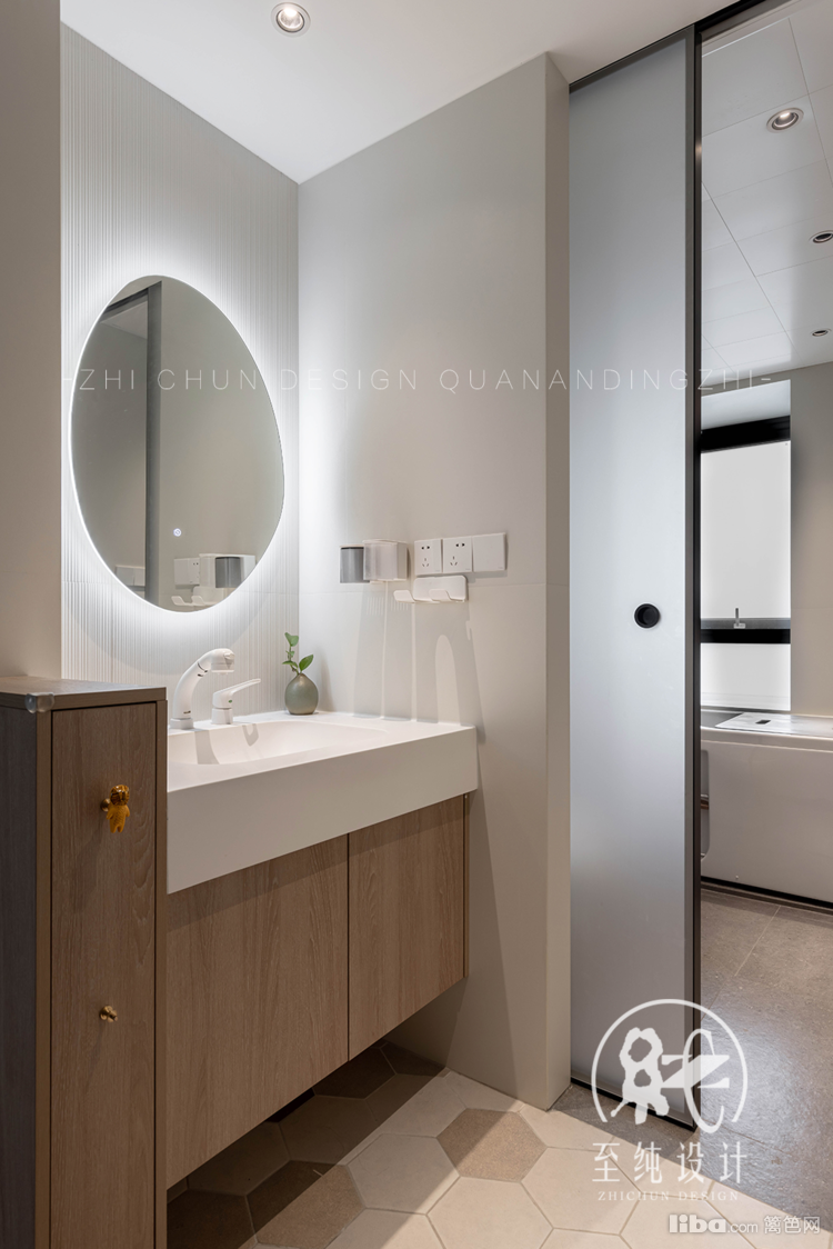 客卫是干湿分离的设计,工艺上去掉传统的门槛石及挡水条,采用地砖直铺淋浴区域下沉的办法,借坡度解决排水问题。