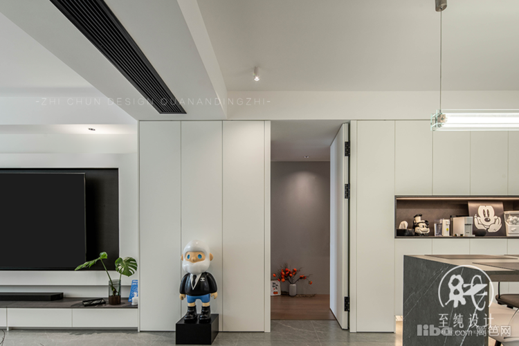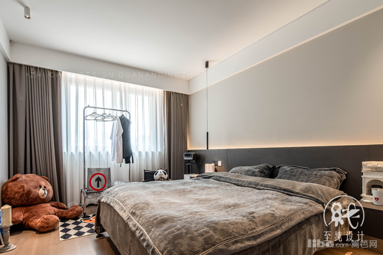 03_卧室 房屋户型整体南北贯通,借规整格局做了“上下动静区”分隔。开放空间的电视柜及餐边柜延长线既是主卧必经之路,也是动静区的分割线,中间做隐形门设计更加保证了主卧和书房的隐私性。