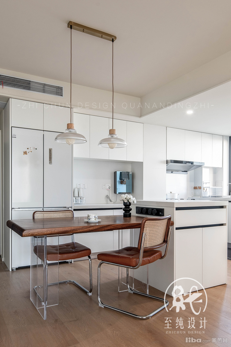 胡桃木的餐桌搭配亚克力桌腿,自带悬浮效果。