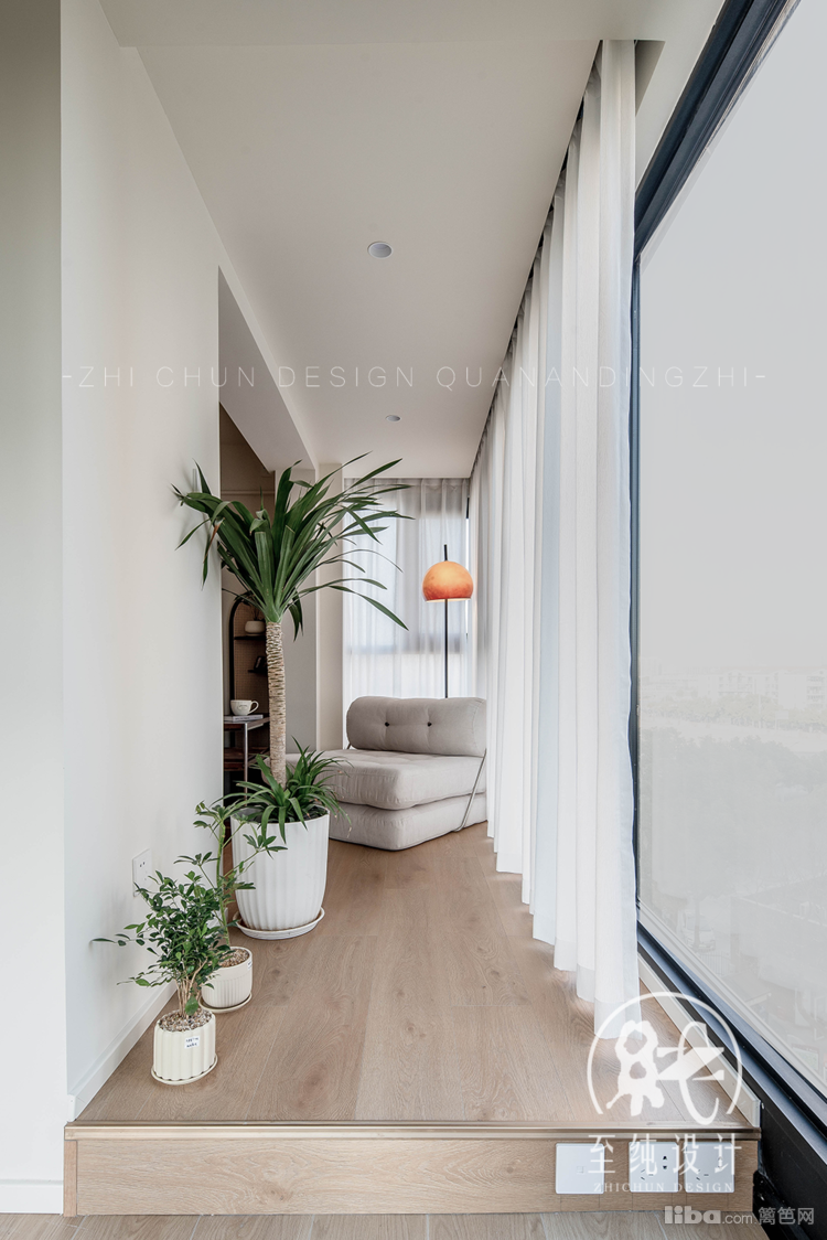 L型阳台划分成了两个区域:功能区、休闲区。部分抬高10公分做为休闲静思区域,看书、发呆、小憩,引入充足的光线同时柔化了光线。另一部分借拐角做“隐藏”式家政阳台,清洁和收纳都在此处。