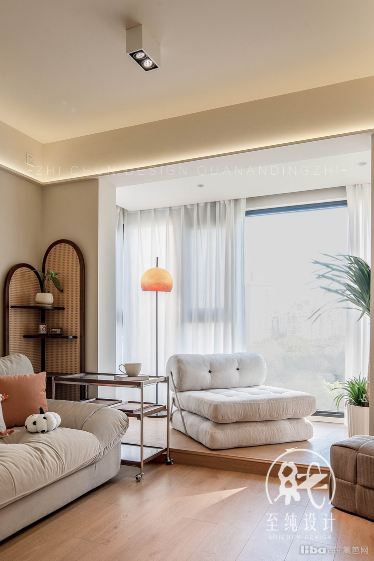 全屋墙顶通刷立邦春雨,地面通铺地板,奶油色的沙发,搭配胡桃色家具与藤编收纳屏风。