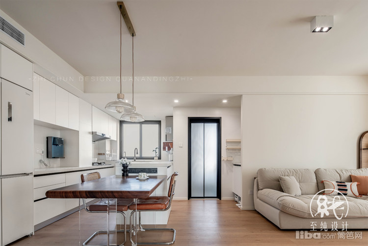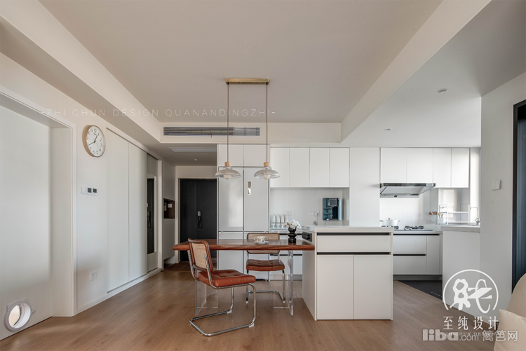 全屋以岛台餐桌为中心,形成一个洄游动线;中为动区,边为私密静区。