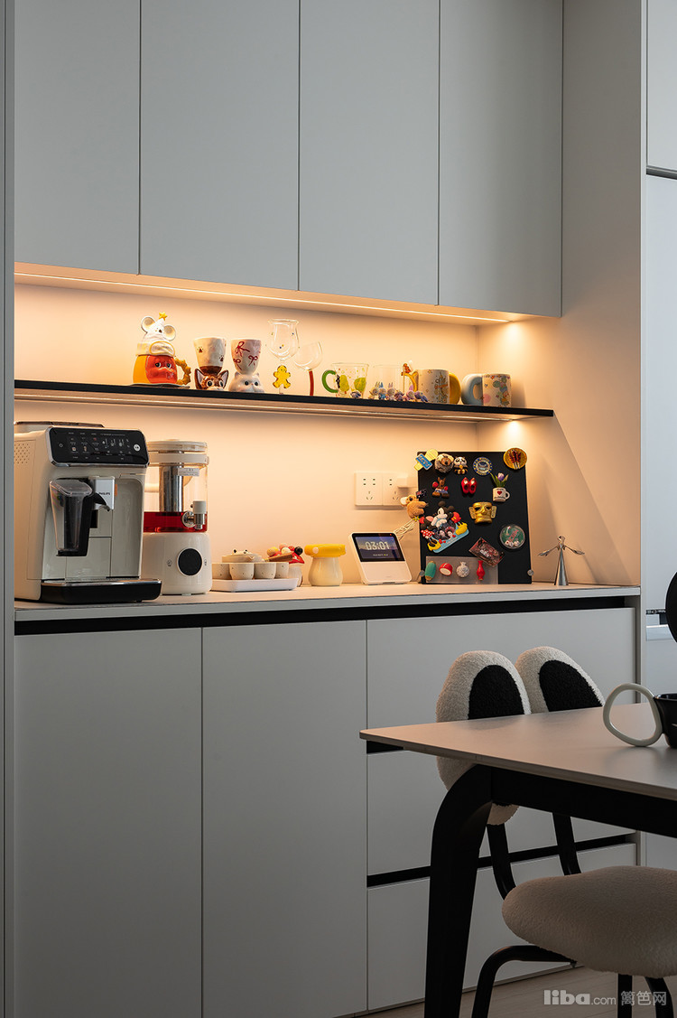 开放式厨房与餐区浑然一体,嵌入式冰箱和巨型餐边柜满足所有幻想。