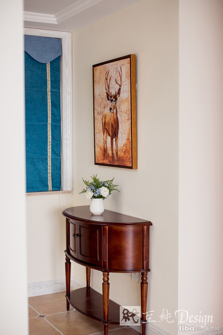 美式的角柜配上一幅富有感染力的古典动物油画很是搭配,配以白烤瓷玫瑰花艺,点缀一些绿色赋予原本狭小而易被忽视的一角蓬勃生机。