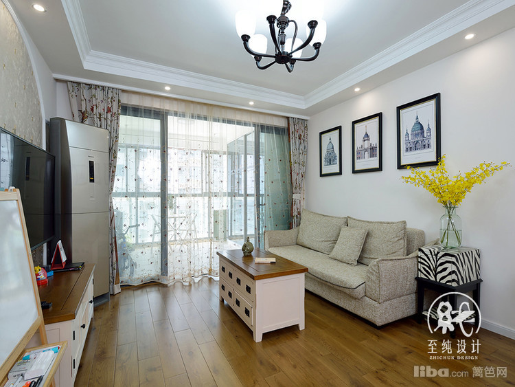 整体色调偏白,客厅中的电视背景墙和飘窗都采用小碎花,风格统一的同时也给人一种温馨的感觉。