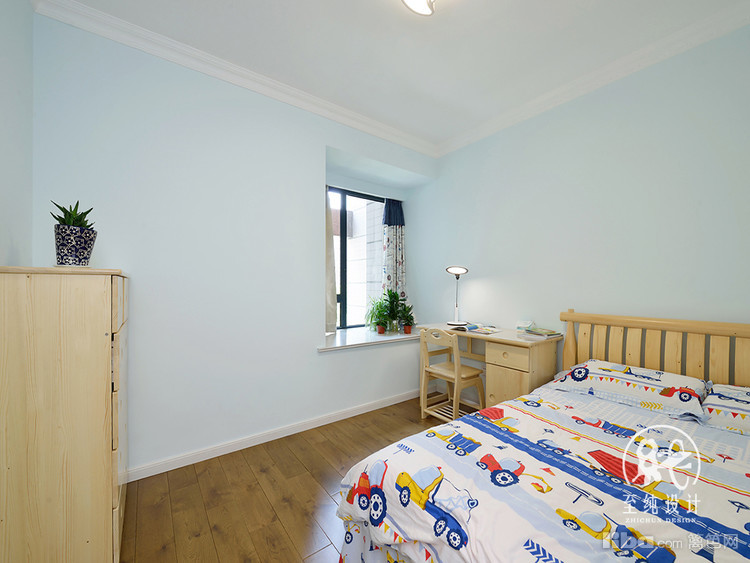 客厅背后的卧室,飘窗使得空间很明亮,卧室中间的床、床头柜都是实木的,有种沉稳的感觉。