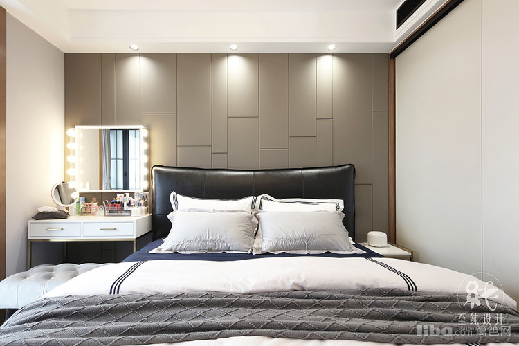 大象灰的皮纹硬包,相比于乳胶漆,色调更加沉稳与柔和。