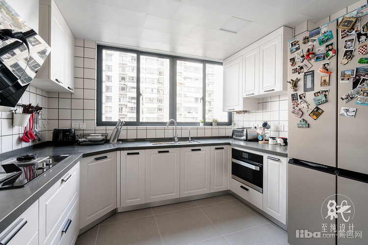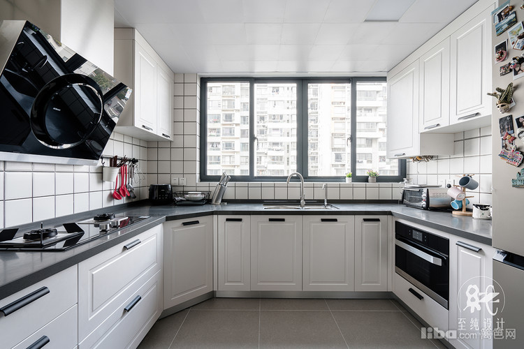 U形设计,厨房和餐厅用玻璃移门隔开,打通空间,保持空间通透,空气流通。