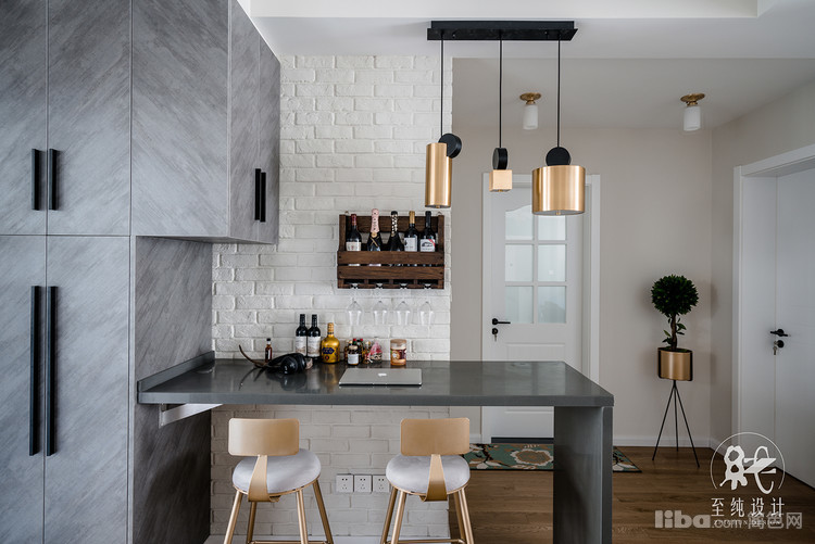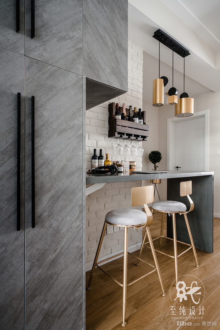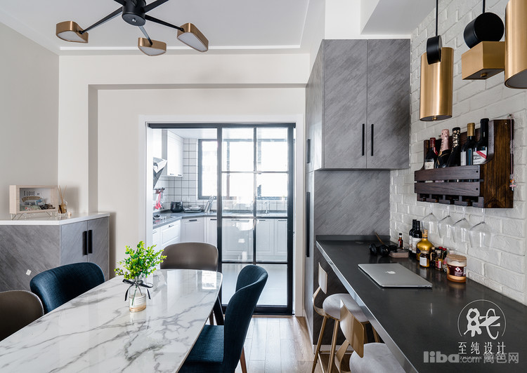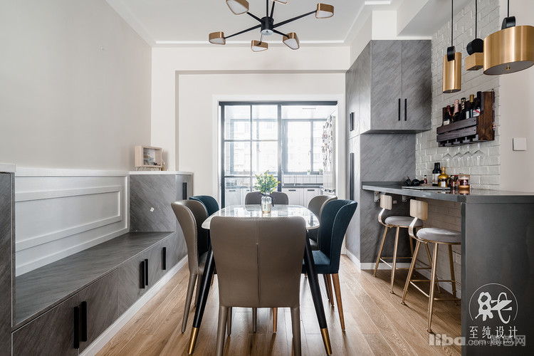 餐厅部分现做了吧台和酒柜设计之后,再放餐边柜及餐桌显得着实拥挤,所以定制了卡座+餐边柜相结合的设计,让过道的空间不至于过于逼仄。