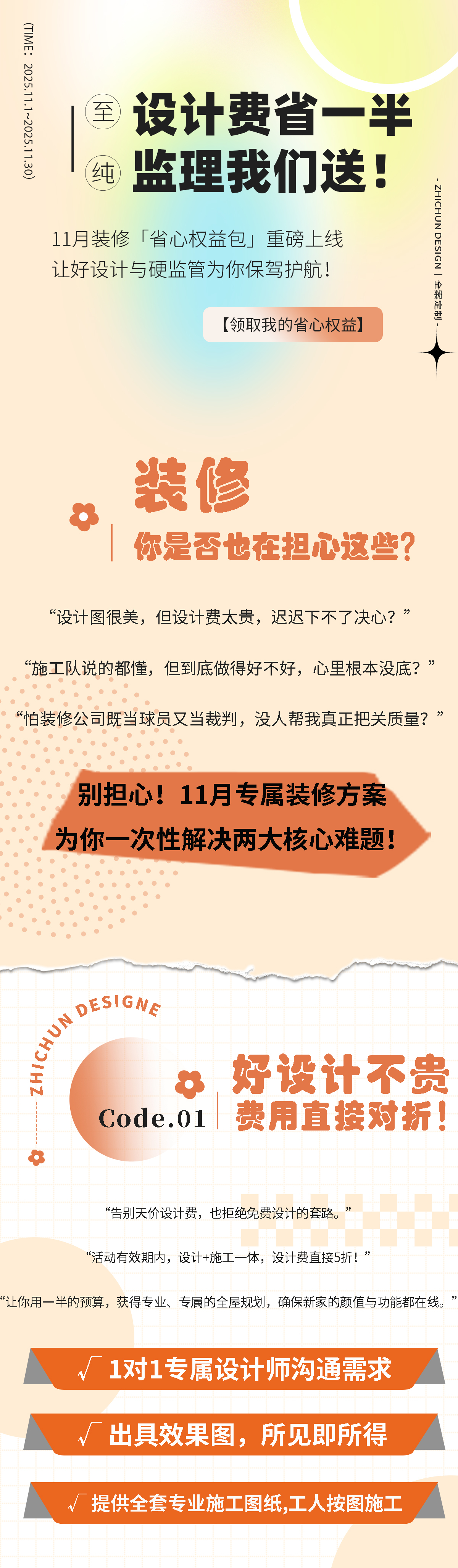「设计费5折」与「第三方监理」,11月装修「省心权益包」重磅上线,让好设计与硬监管为你保驾护航!