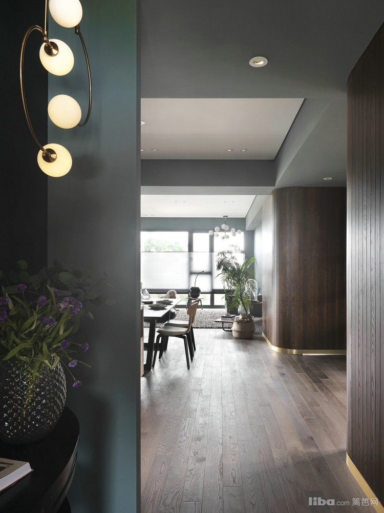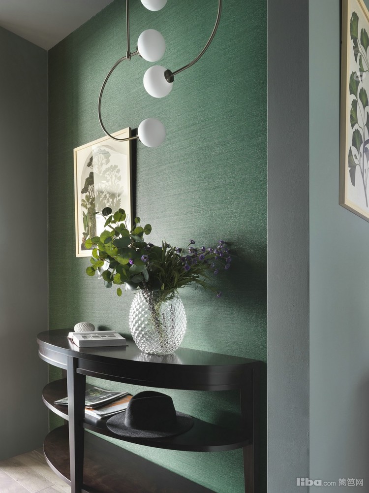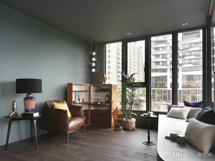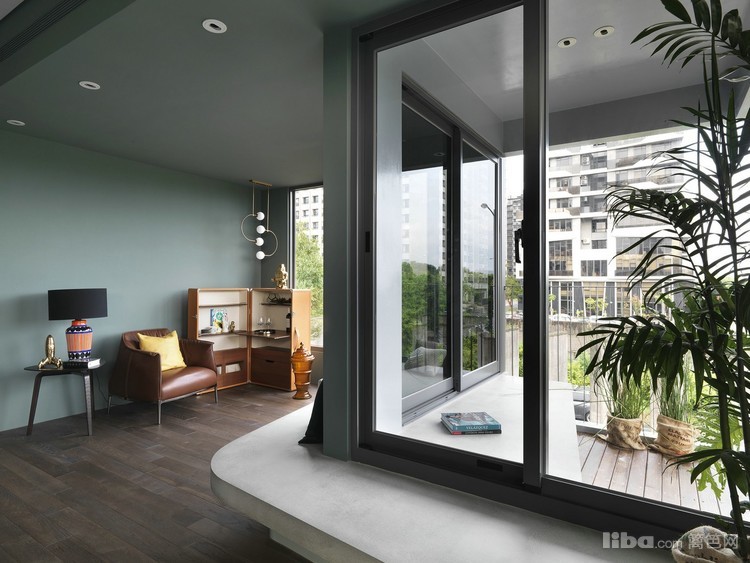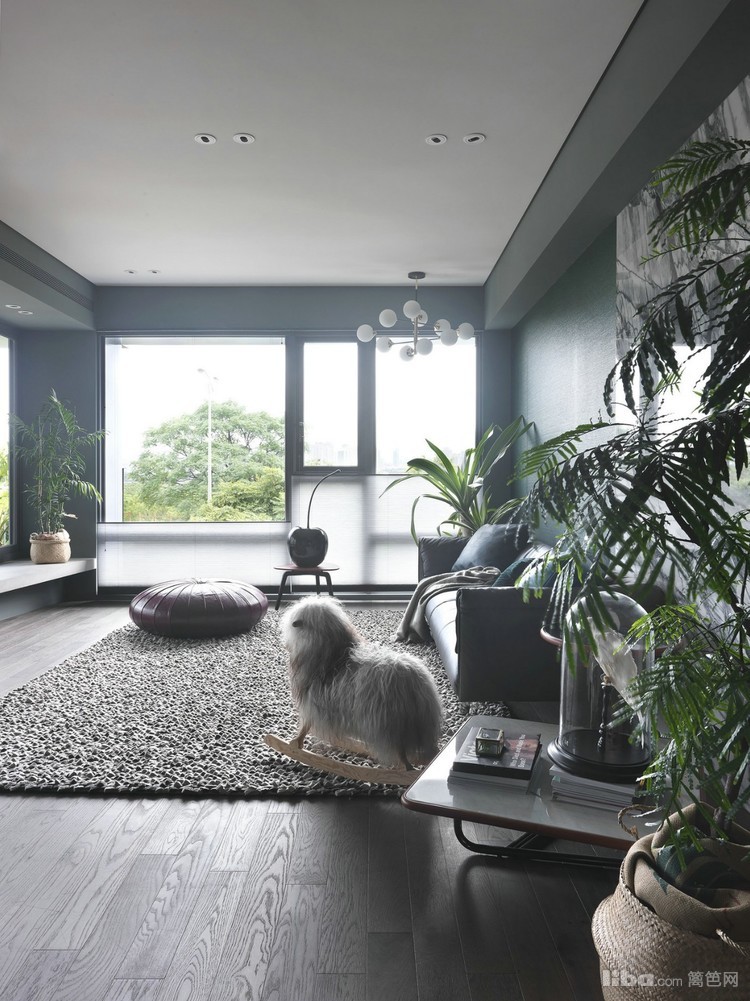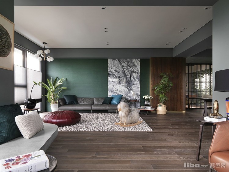 客厅以墨绿色为基色,辅以绿植更能彰显家装设计感觉。