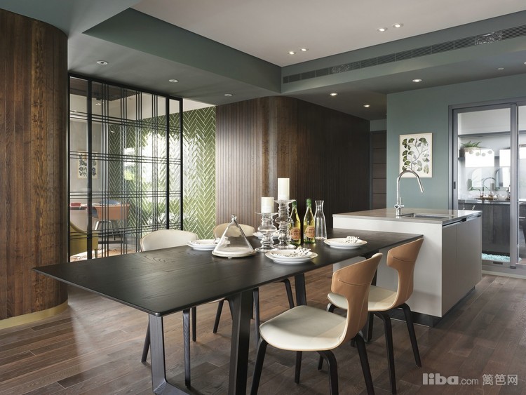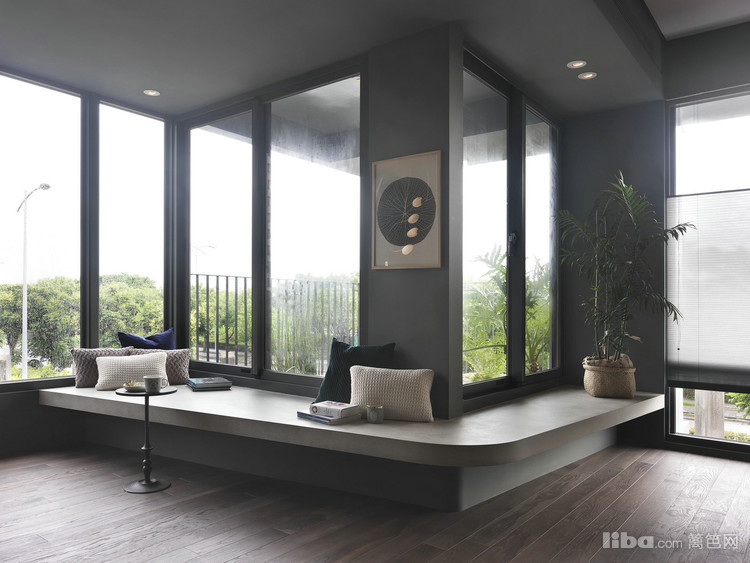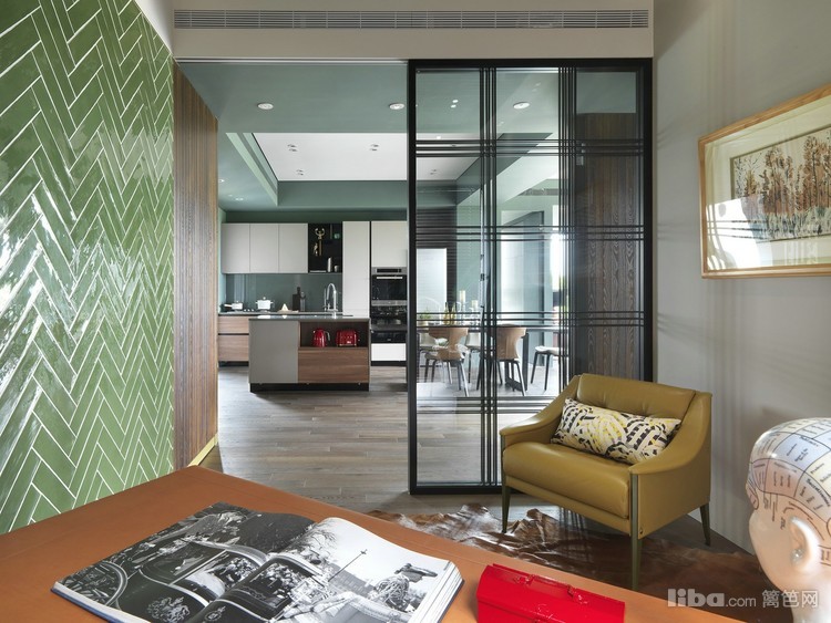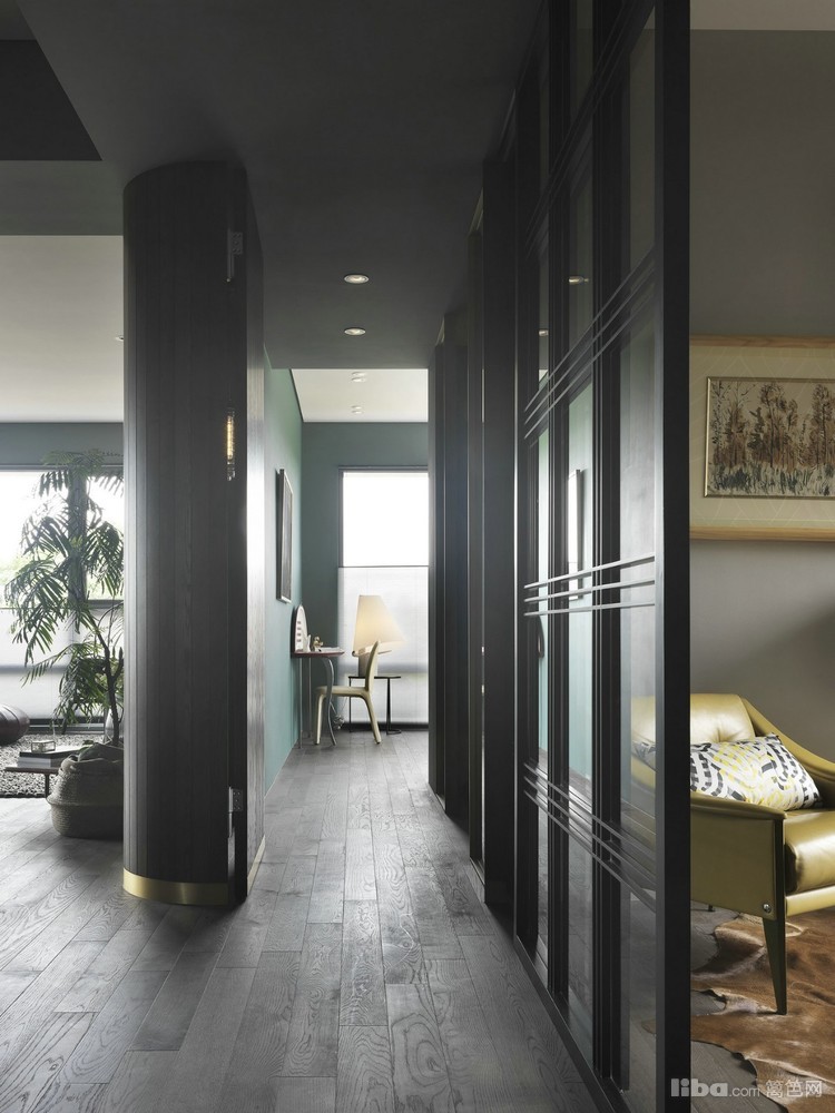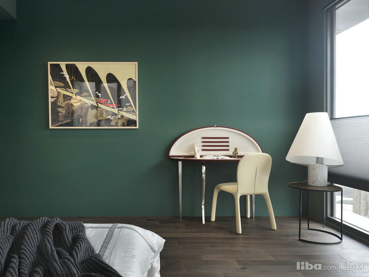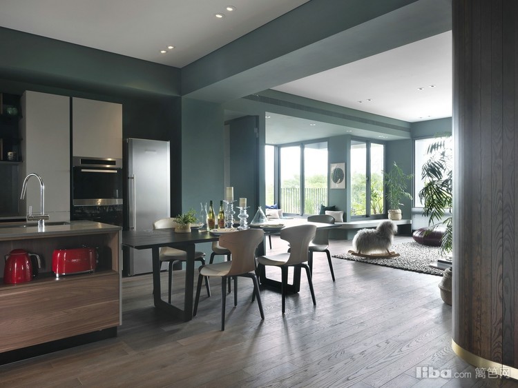 客厅以墨绿色为基色,辅以绿植更能彰显家装设计感觉。