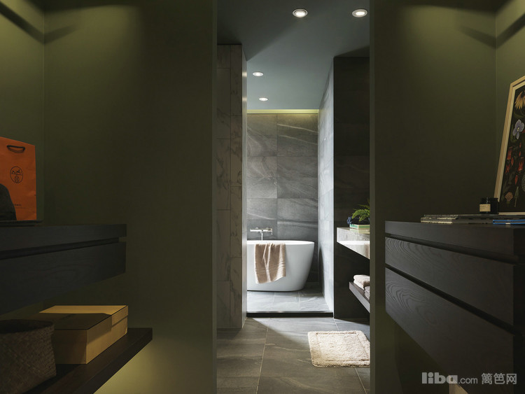 卫生间采用了墨绿与黑色搭配。干湿分离。