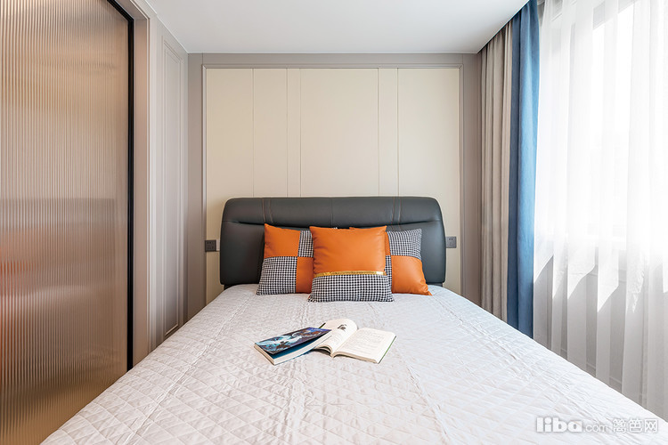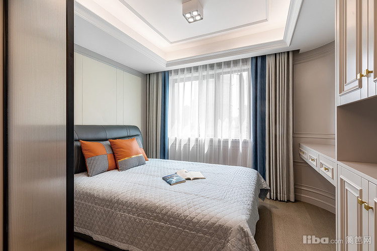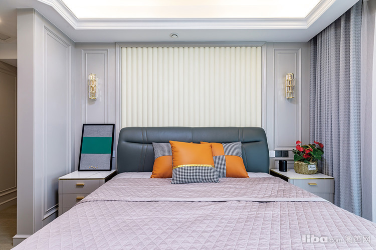 主卧整屋驼灰色的护墙板包裹,线条分明,双眼皮满吊顶,视觉空间宽阔不压抑;次卧做了空间划分,次卧内间用于男孩睡觉,外间设计成了多功能房(兼睡觉功能)