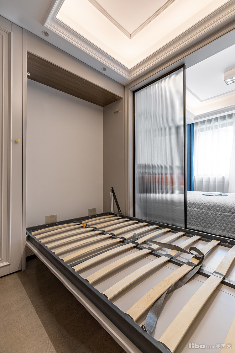 为了避免双间床位占用空间的问题,设计师在左边柜门设计了一个隐藏式床板