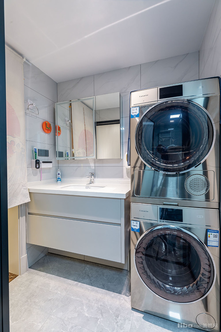 卫生间做了四式分离,左边是洗漱台及洗衣区,正对的门是淋浴间