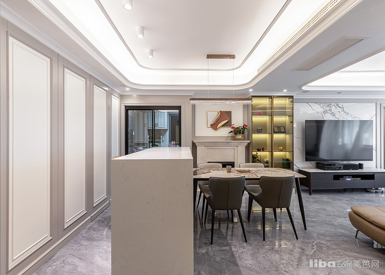 餐厅整体区域做了合理的动线划分,顶部采用双层欧式石膏线条吊顶增加空间的深度感,下方增设了中岛台让餐桌摆放更有归属感。