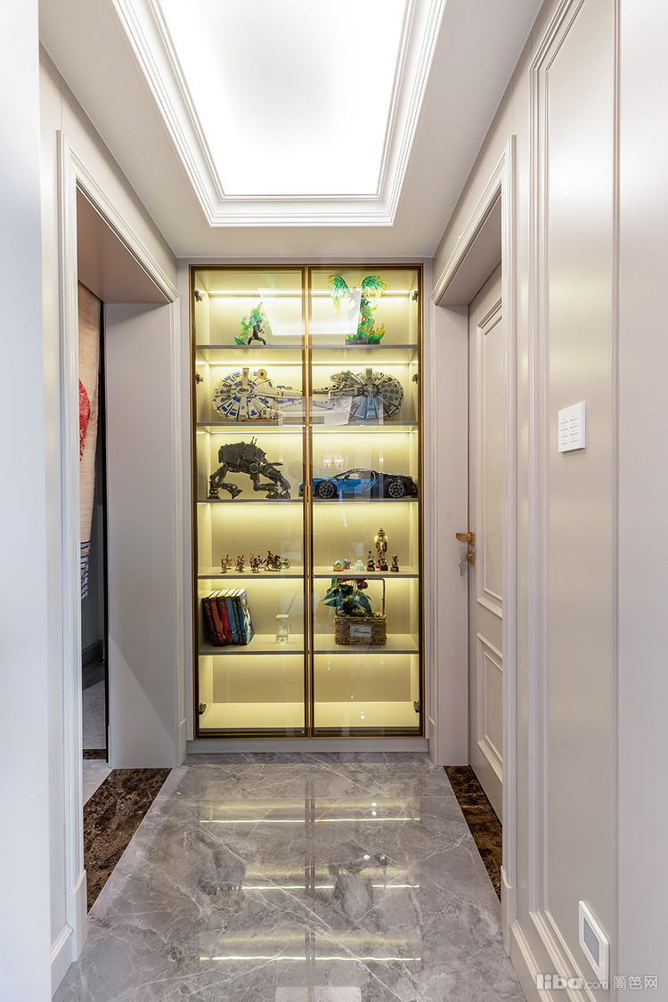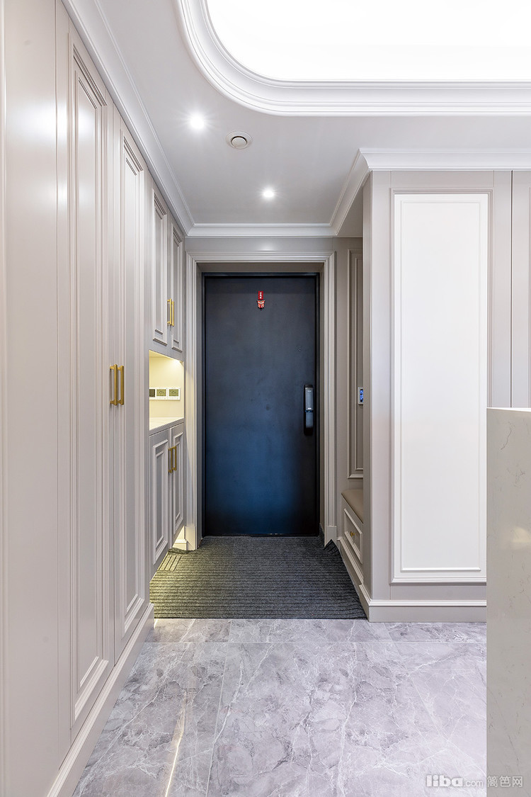 进门处设计了内嵌式的换鞋凳,整个杂物间外层做了护墙板包裹。