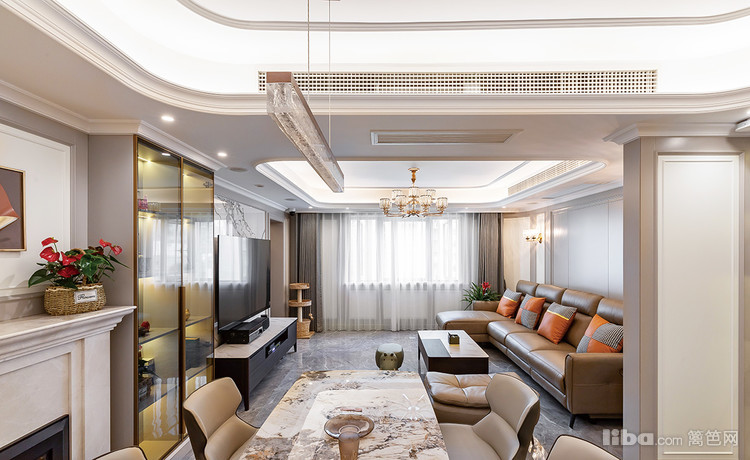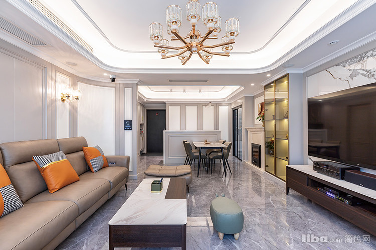 巧妙设计造就完美空间,映入眼帘的客厅展现出了殿堂级的轻奢感,卫生间门洞填充后,做出宽大的电视背景墙,挂上了70寸的电视,坐在欧式的真皮沙发上尽情享受家庭影院。