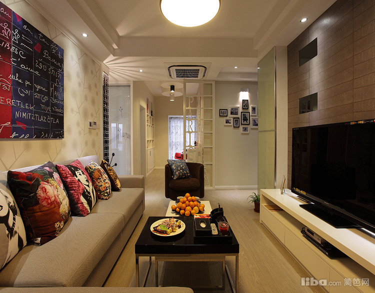 客厅深灰色略带纹理的电视背景墙,几何状的白色木板拼凑在了一起,形成一面独特的电视背景墙。白色的电视柜与浅色系的木地板,正好与黑色的背景色冷暖交替,冷艳的同时,又充满了温馨感。