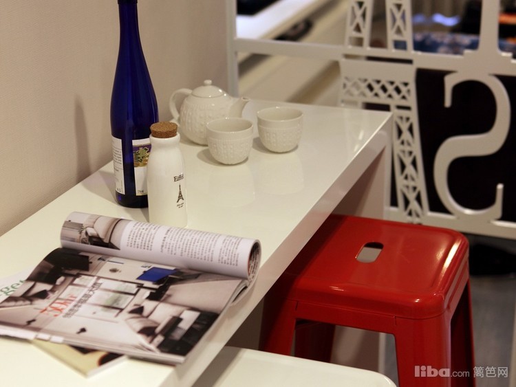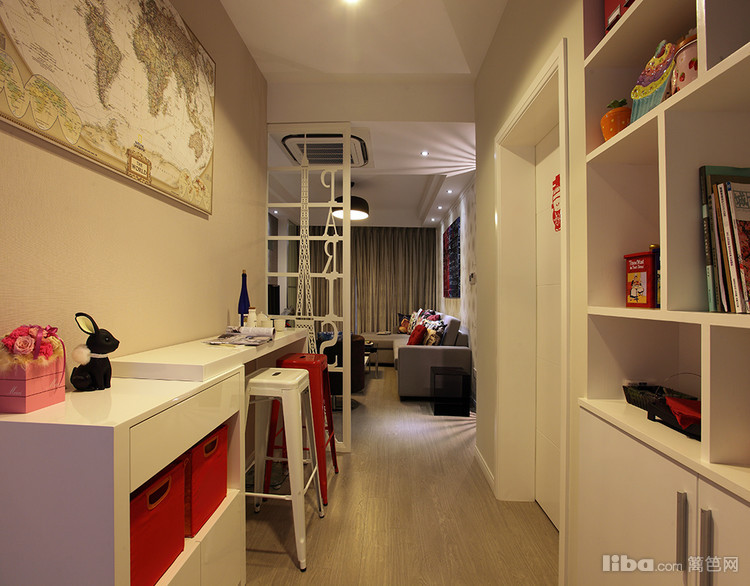 白色立柜满足了主人的收纳需求,设计师别出心裁的开辟出一方小小的休息区,红色皮椅提亮了整个空间。