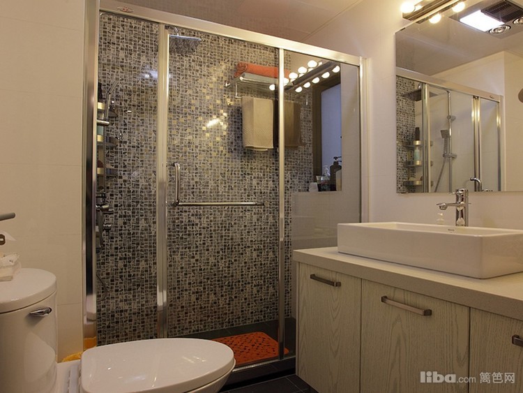 马赛克图案瓷砖创意感十足,与地面的彩色块毯相映成趣,浴室也能充满创意~