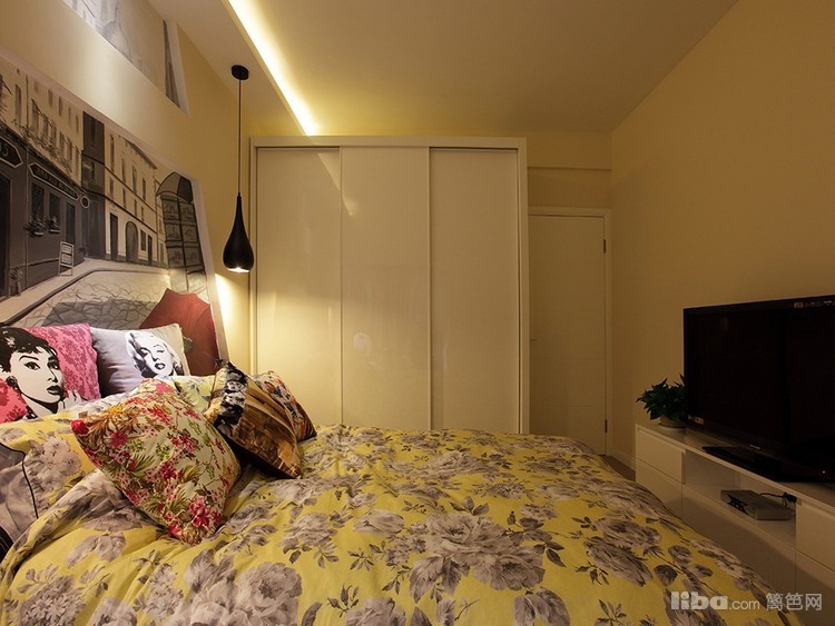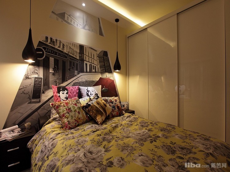 充满现代气息的背景墙纸和延生感强烈的吊灯使卧室时尚感十足,碎花田园范软装搭配增添了甜美的气息。