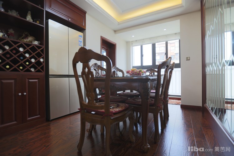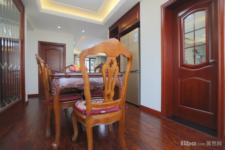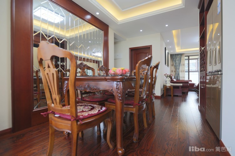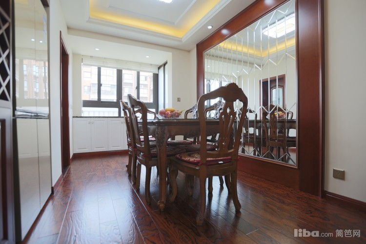木质餐桌椅使空间充满自然感受,悬吊式的柜体设计,轻化量体的重量。背景墙利用镜面材料成为一道亮眼的风景,通透而具独立的隐私界定,保持开阔的视觉效果,同时增加家人之间的互动。