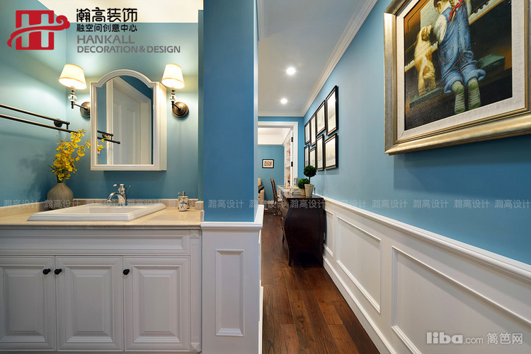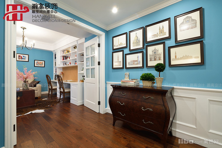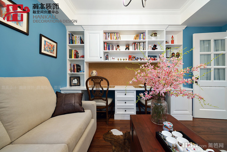 半开放式的书房,配以明亮的蓝色,书香气息之余却又活泼愉悦