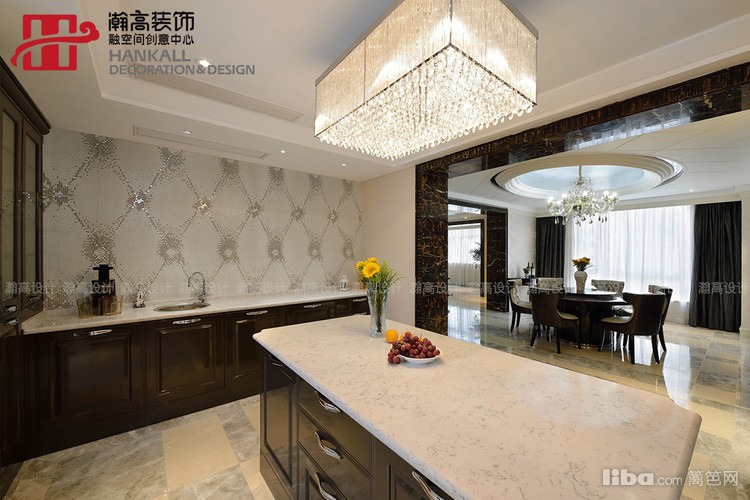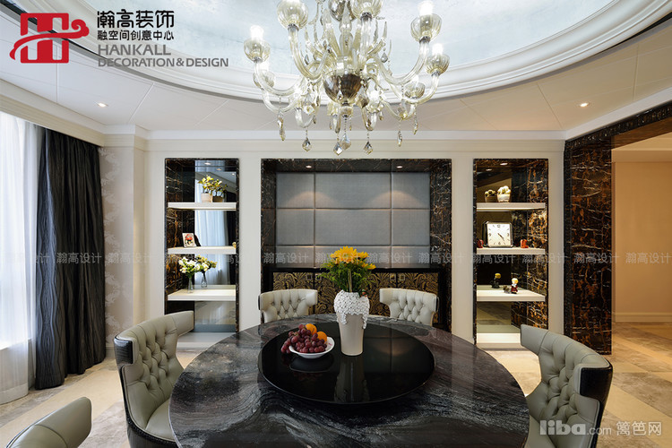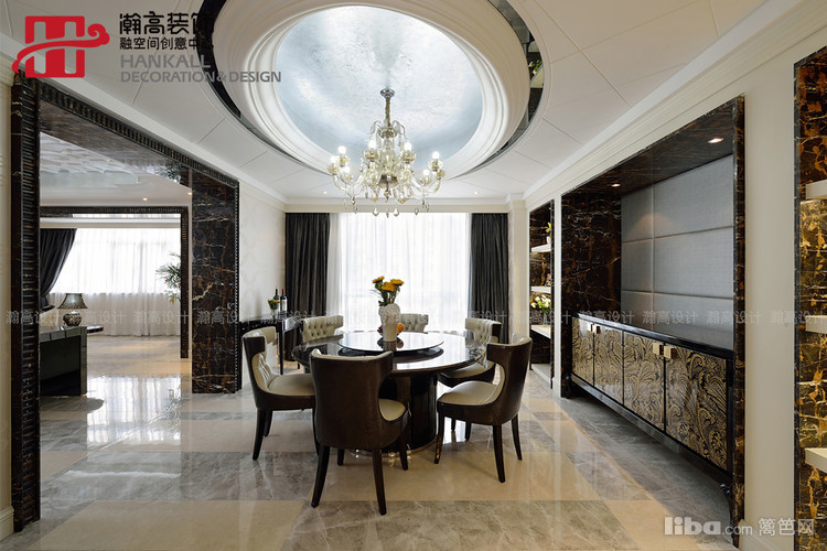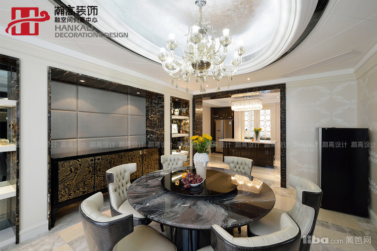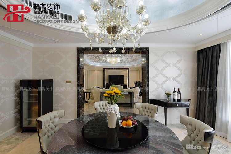 圆形餐桌与与吊顶相呼应,更衬托出水晶吊灯的晶莹剔透与华丽