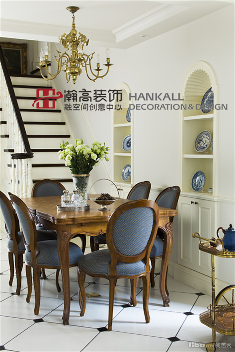 青花瓷摆盘与餐桌椅的颜色遥相呼应,刚柔并济的空间,雅致而高贵。