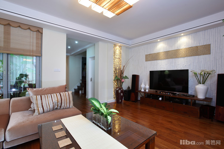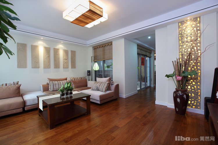 现代舒适布艺的沙发混搭中式的椅子让整个空间更富有乐趣和时尚的气息,以及墙上的稀有的挂画,无不将客厅打扮得出别致的肌理.丰富的视觉效果.