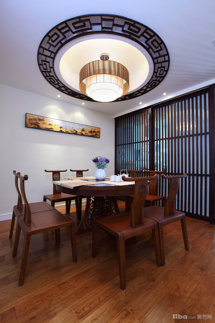 高端大气的吊灯外加中式的餐桌椅,无不把中式古典的柔美与传统的稳重刻画的栩栩如生,制造了一种典雅而细致的格调。