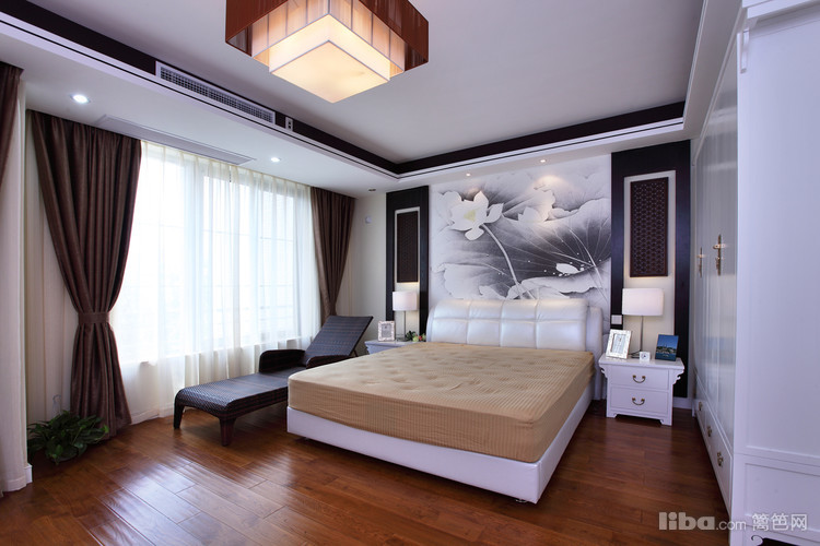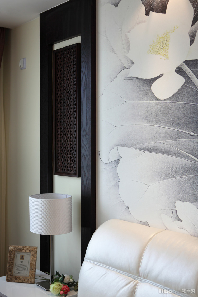 卧室里边注重自然朴实,触感温暖自然舒适,主人特别喜欢荷花作为床头背景墙的一个个亮点 体现主人的高贵典雅气质