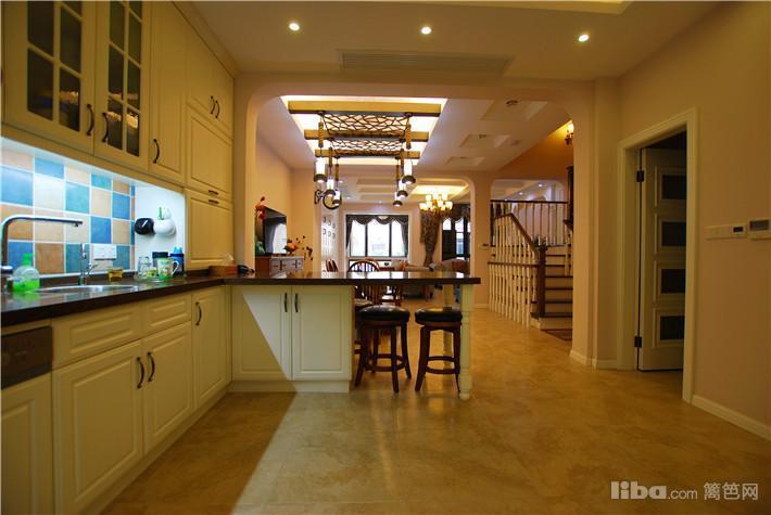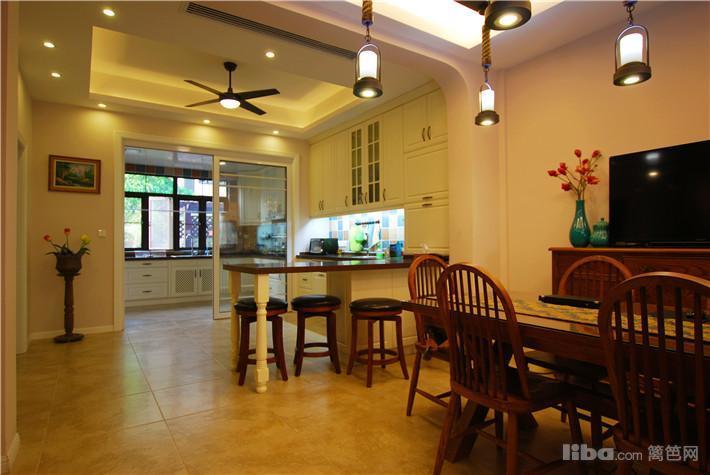 在西厨的位置设计了一个吧台,可以享受下午茶和甜点,在旁边用假梁的设计,划分了餐厅的区域