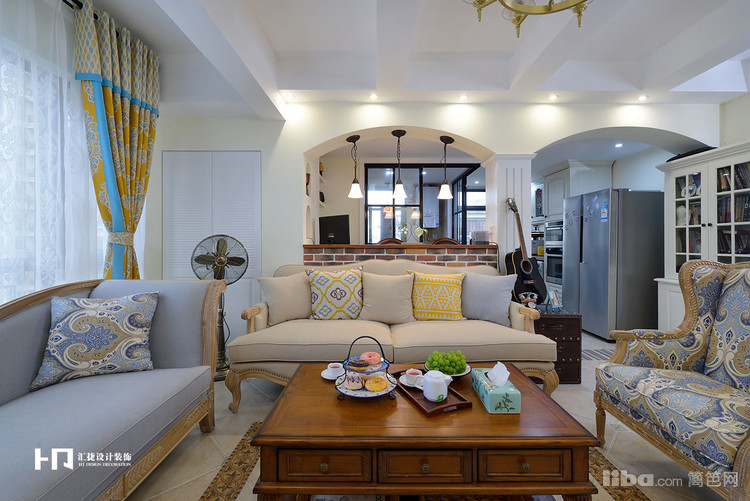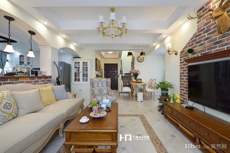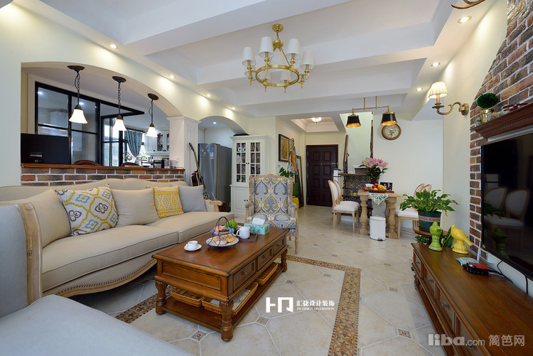 客厅以梁作为分隔,下面是吧台设计,既能分开空间,又美观