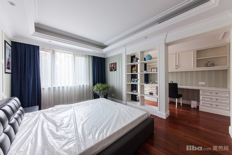 镂空式书架将儿子房的书房和卧室分隔开来,既有空间又有功能。