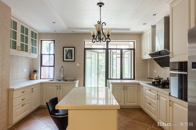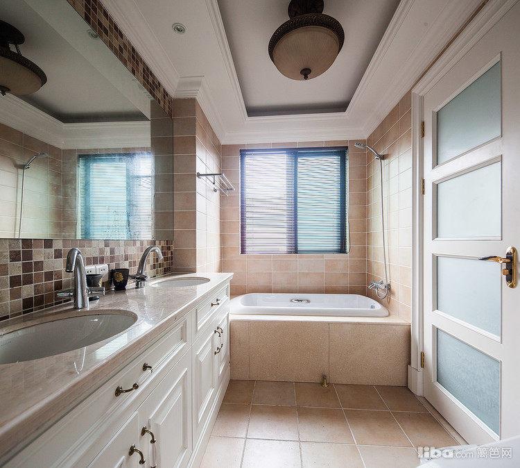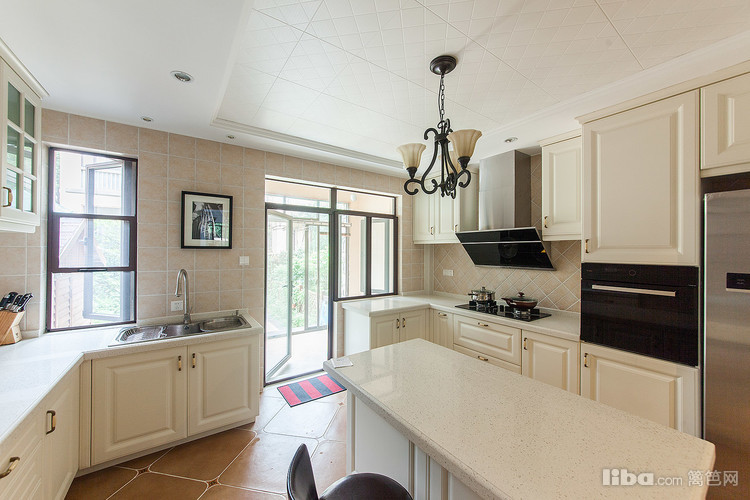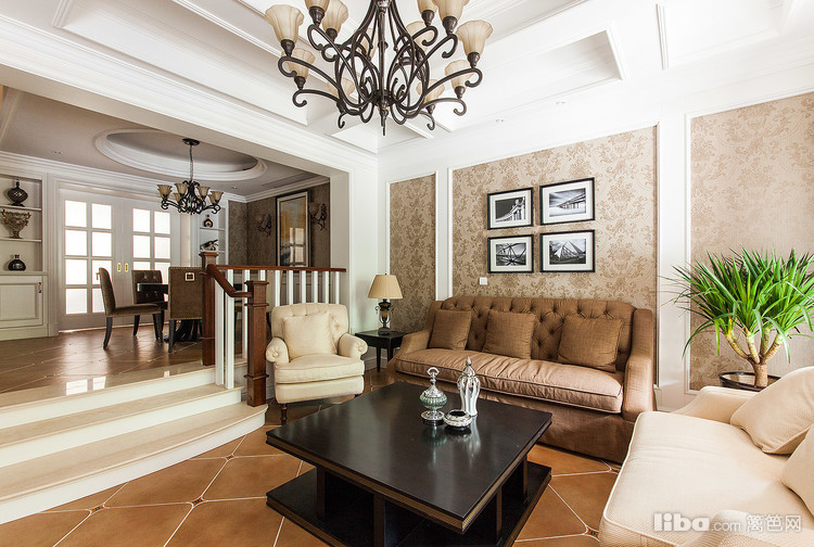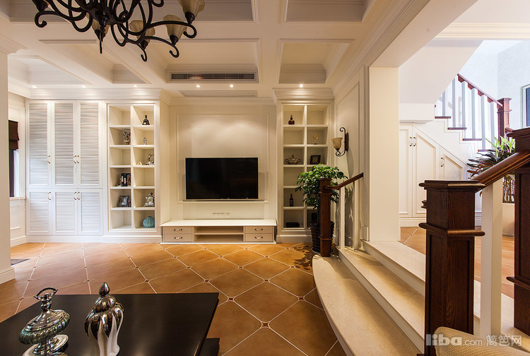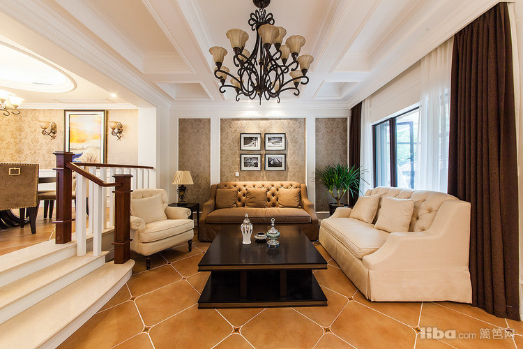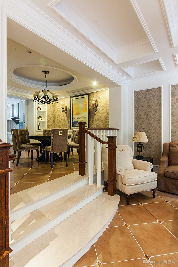 由于干净利落的直线线条构成吊顶,配着温暖色调的大理石地,营造出美式风格随意,温暖,自由的家居氛围。