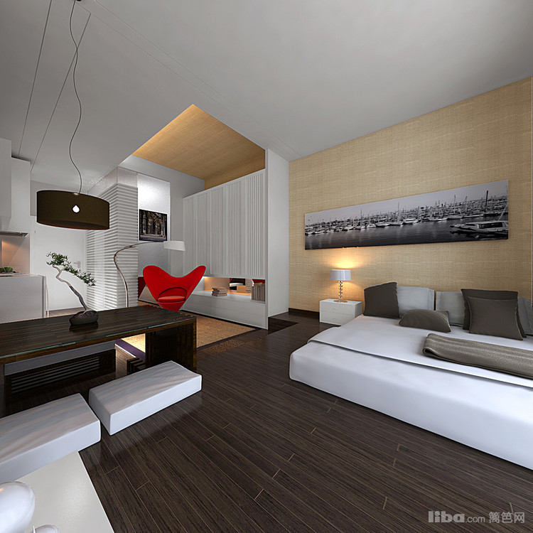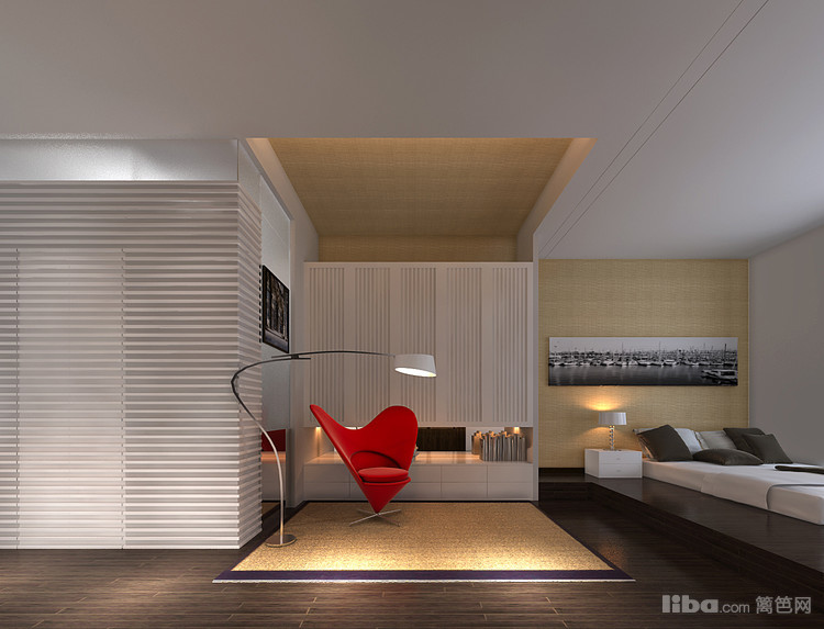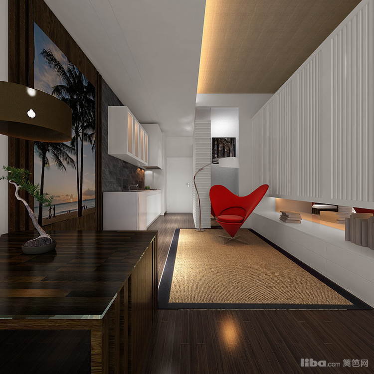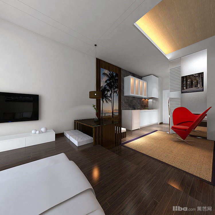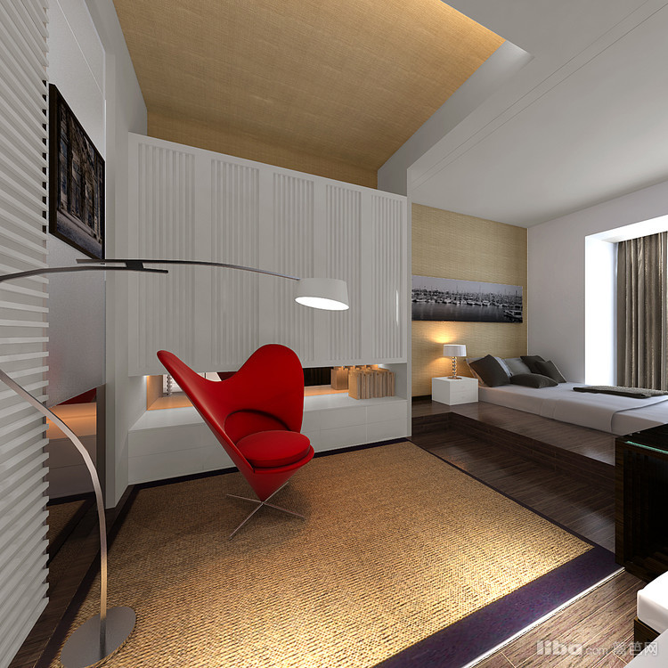 整个方案以白色为主调,配搭深色木地板,文化石,麻布等材质,是整个空间兼备东方禅意的闲适气质之美。