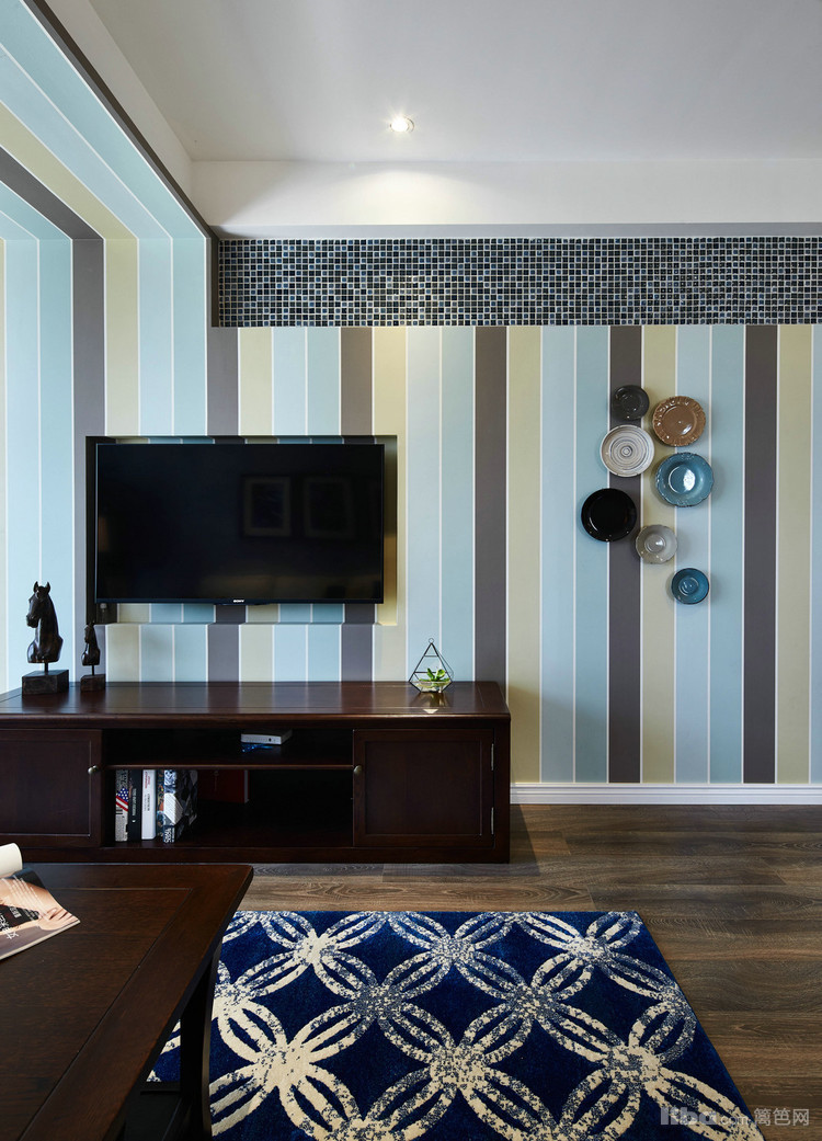 撞色的墙纸来对称高级灰的沙发背景墙,和谐中带着俏皮