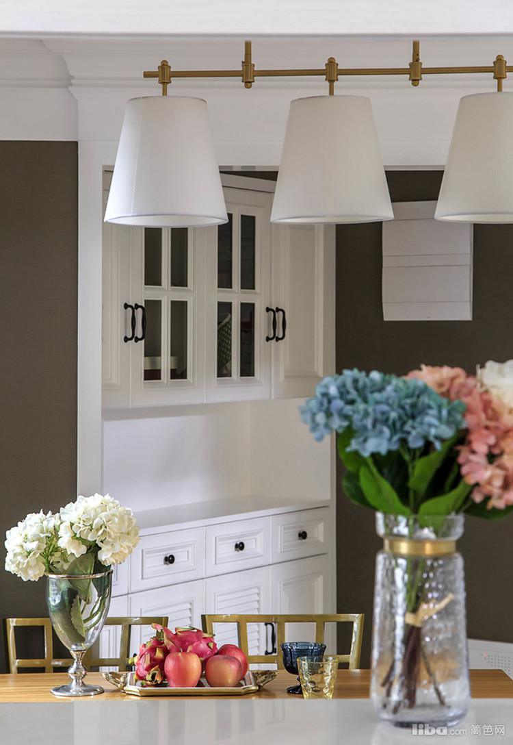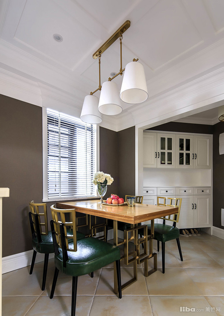 百叶窗外流动的光卧在整个餐厅里,映衬得金属质感的餐桌椅精致质感。 墨绿色是沉寂静默,让用餐空间更令人放松