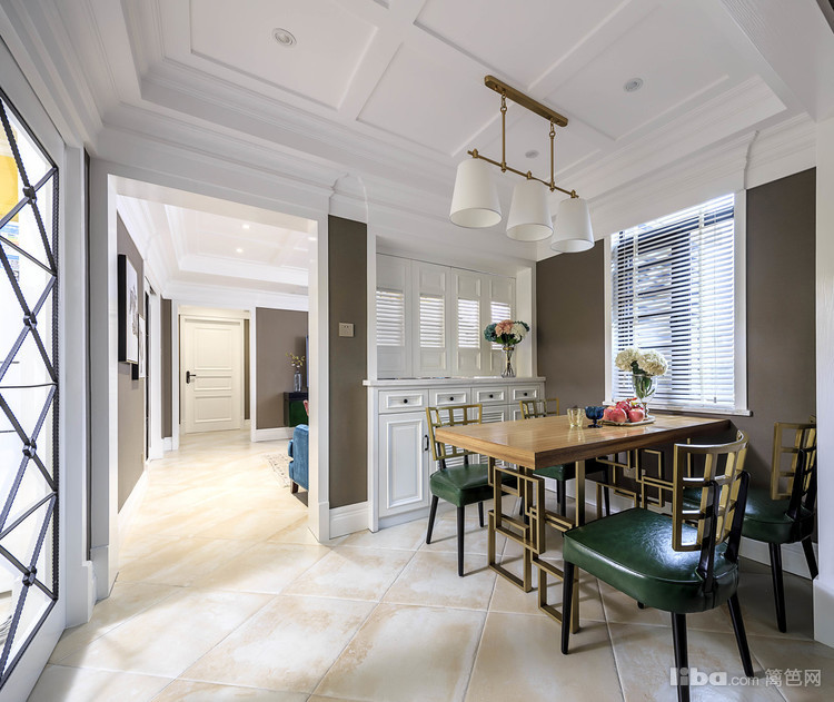 02_餐厅 百叶窗外流动的光卧在整个餐厅里,映衬得金属质感的餐桌椅精致质感。 墨绿色是沉寂静默,让用餐空间更令人放松